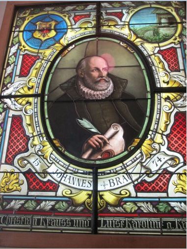 Glasfenstern der Stadtkirche mit seinem Bild aufforderte einen Glauben zu