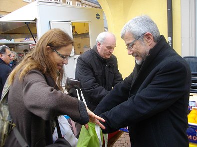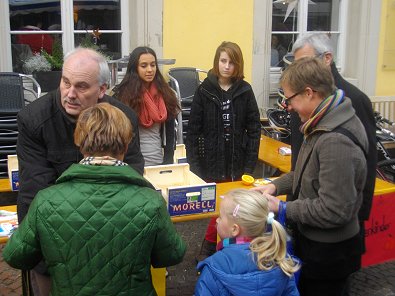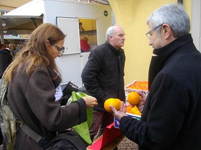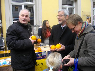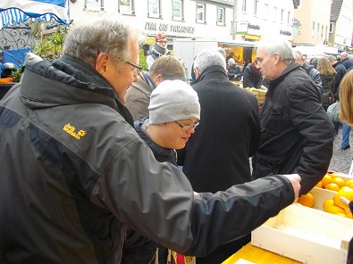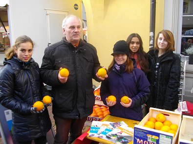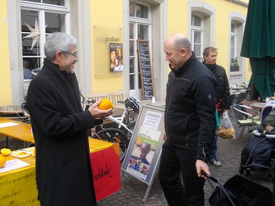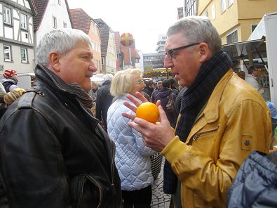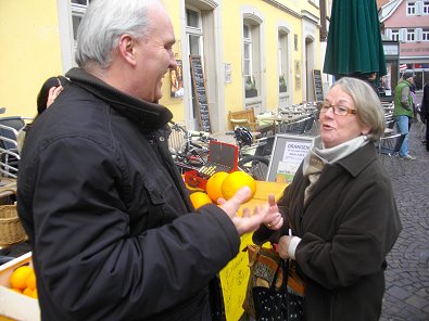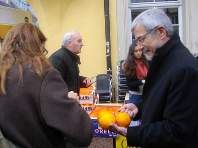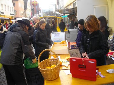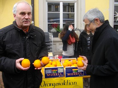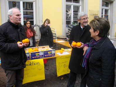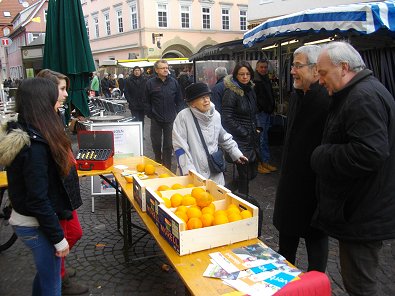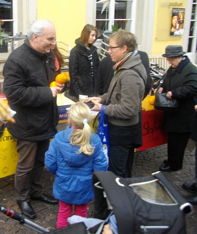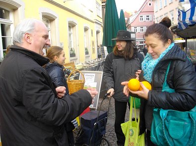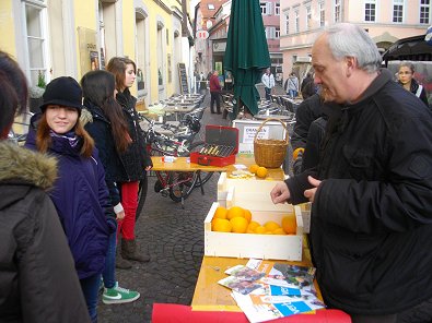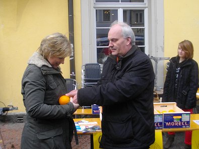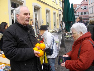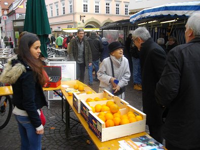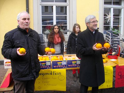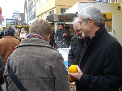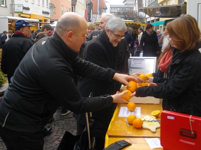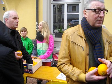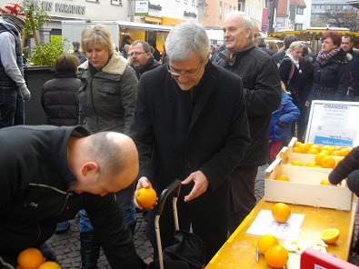 Richter auf dem Aalener Markt Orangen für Hilfe in der Dritten Welt. So ganz
