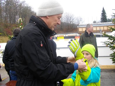 Liebevoller Pappi:OB Gerlach hilft Tochter Annika in die Handschuhe