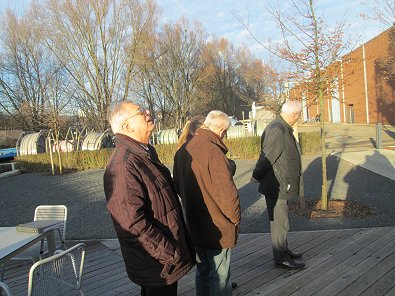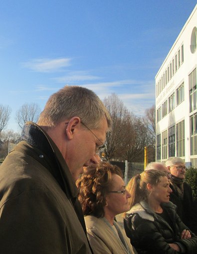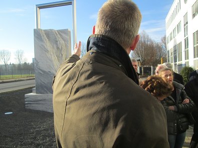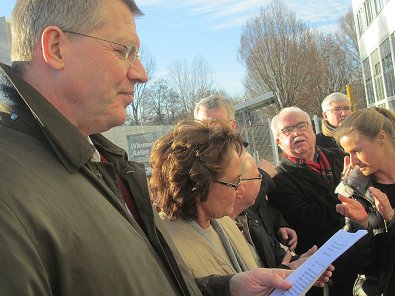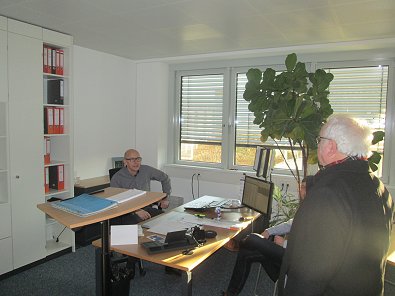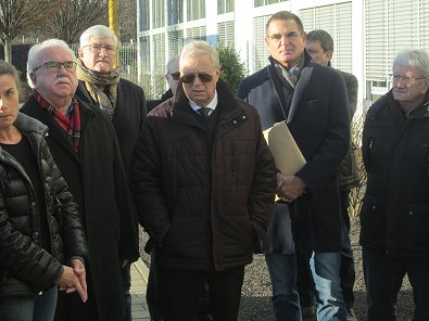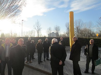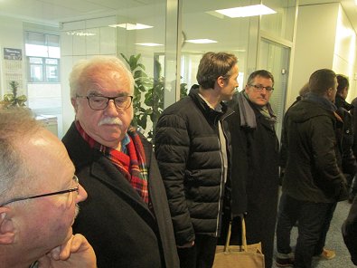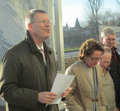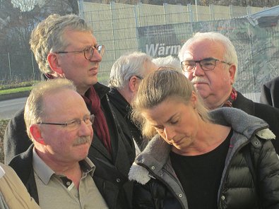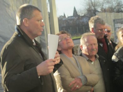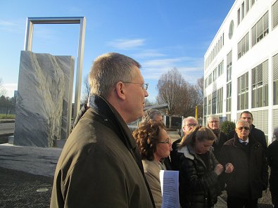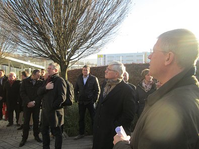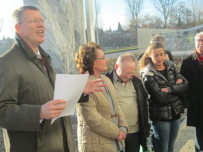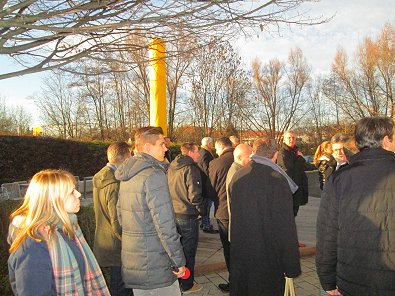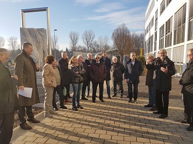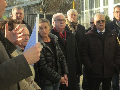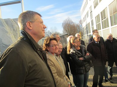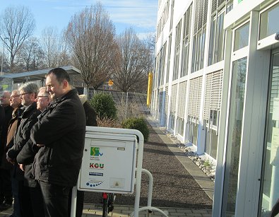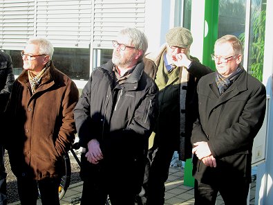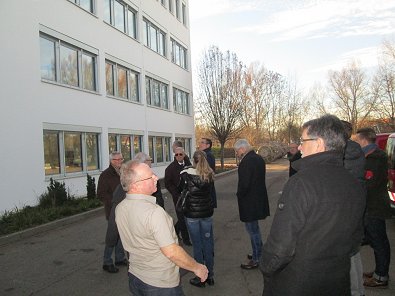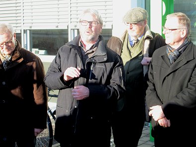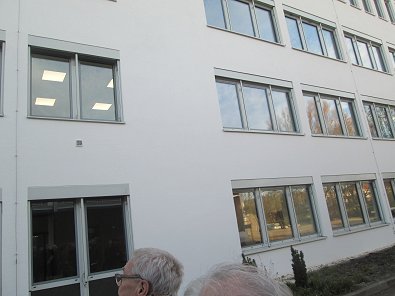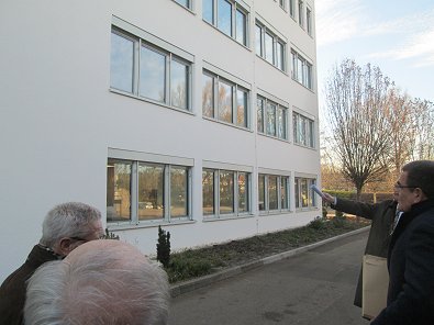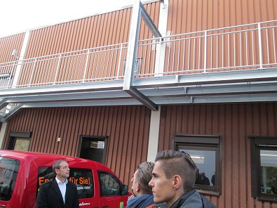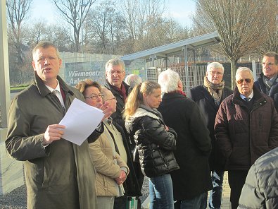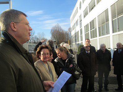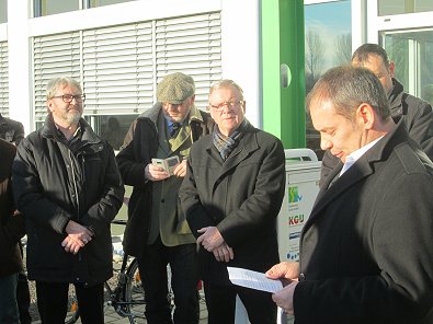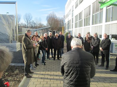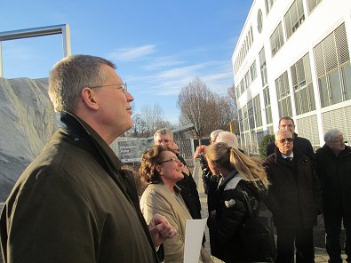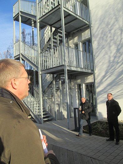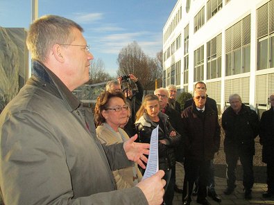 dem Eingang des Stadtwerkehauses im Hasennest. Rudolf Kurz erläutert die