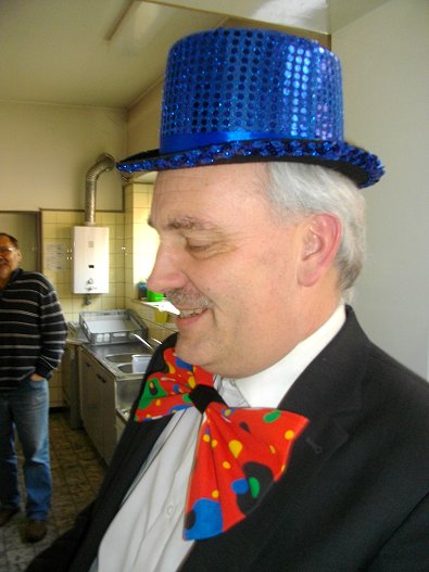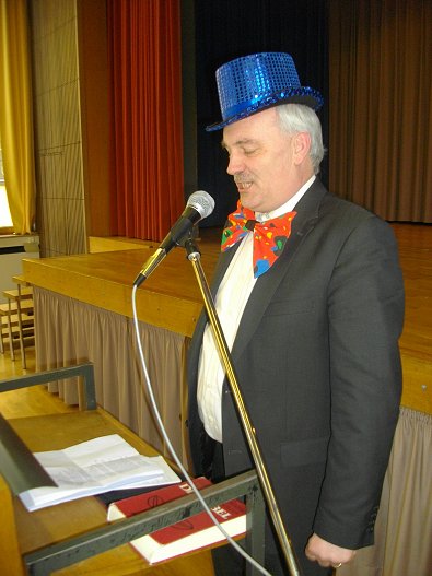 Narrenkappe und Narrenkrawatte bewaffnet im vollbesetzten Saal vor etwa 200