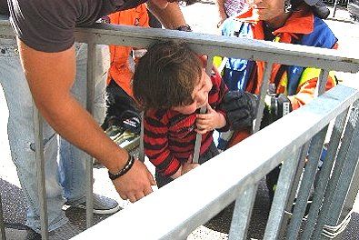 Grünen-Ratschef Michael Fleischer und Sohn im Rettungs-Zentrum.