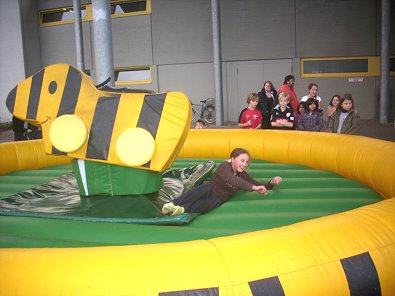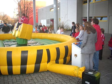 Vor der Greuthalle mussten sich die Jugendlichen auf dem Reit-Bullen