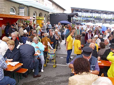 Besucher ein großes Bahnhofsfest mit einem bunten Familien-programm.