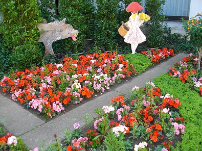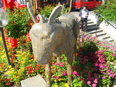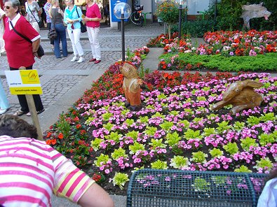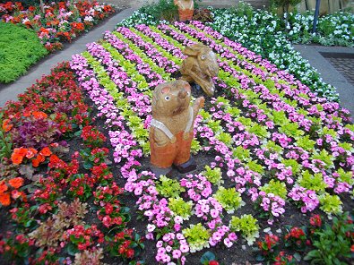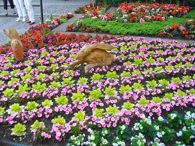 Der Hase und der Igel mitten im Blumenmeer vor dem Rathaus