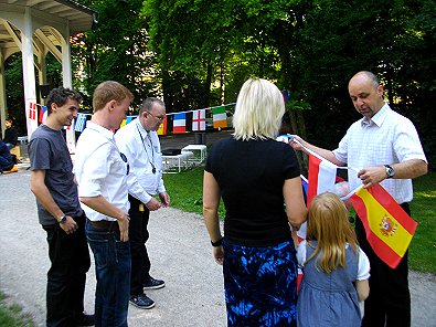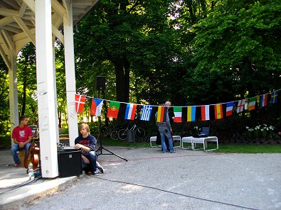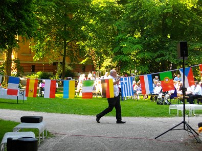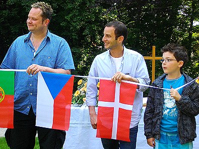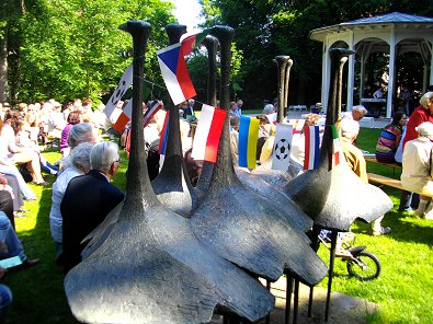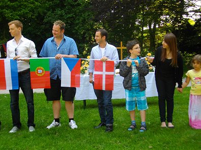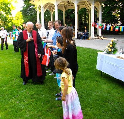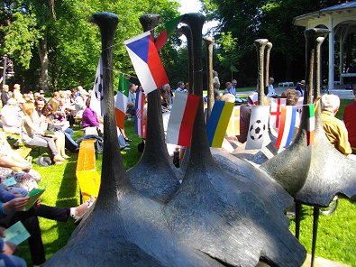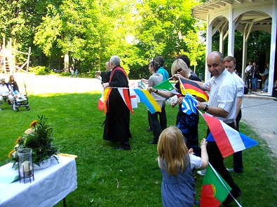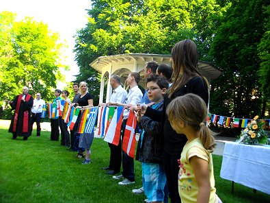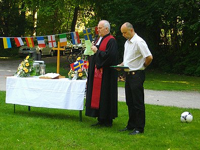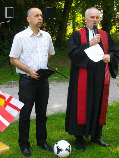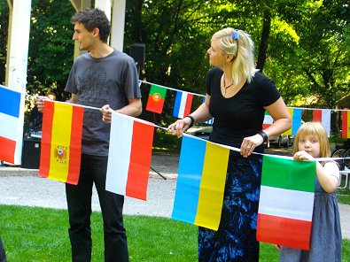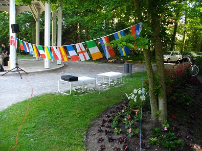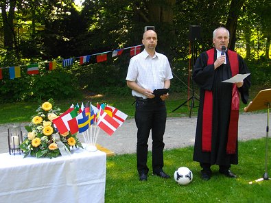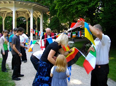 19 EM-Fahnen der Länder im Stadtgarten und Pfarrer B. Richter...