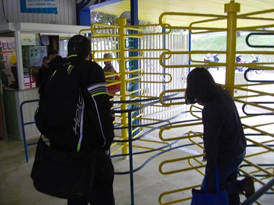 Schuhe ausziehen und durch das Reinigungs-Bad laufen oder ausnahmsweise an