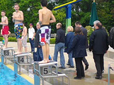 auch die freiwillig bereits auf den Startblöcken stehenden jungen Schwimmer