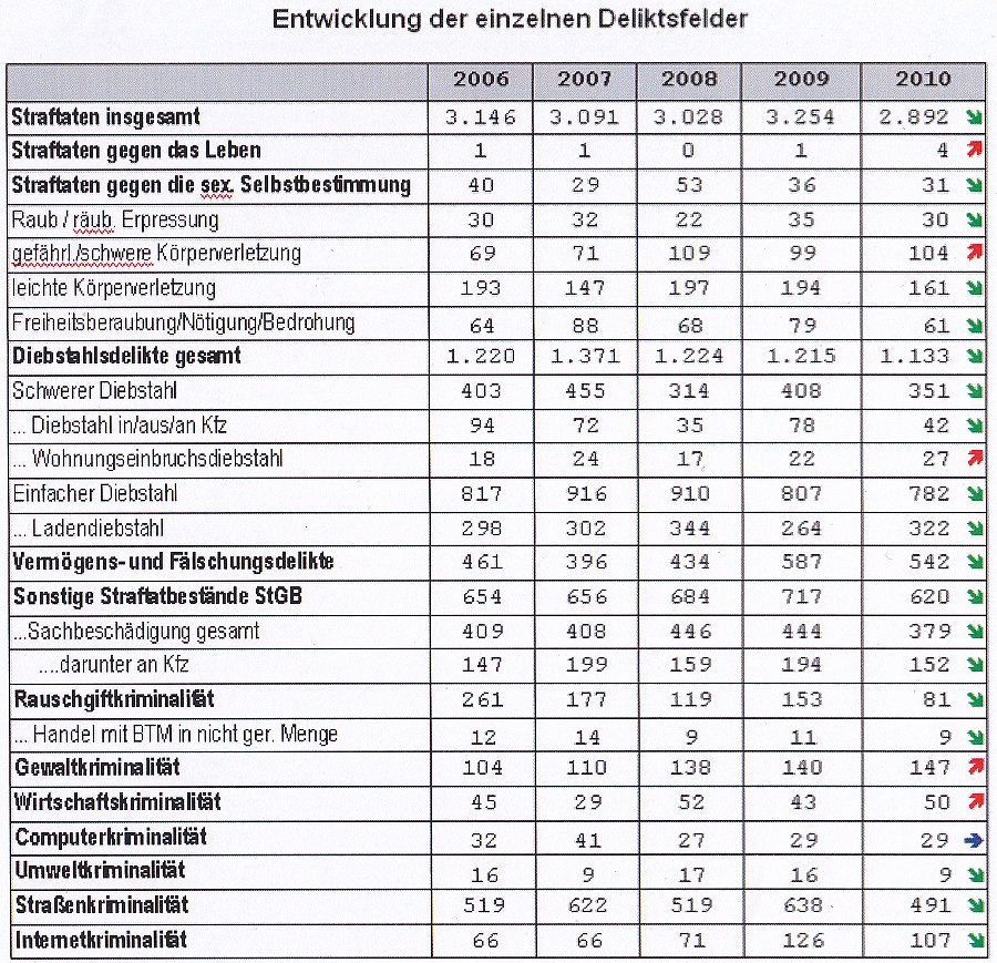 Die Entwicklung der Deliktsfelder in 2010: 53,8% weniger Fälle (minus 36 auf