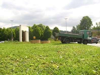 das Gras am Kreisel mit dem Lkw fleißig abtransportiert