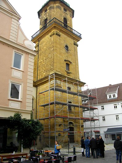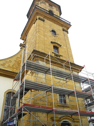 Sanierungs-Arbeiten am Turm der Stadtkirche St. Nikolaus begannen am Montag