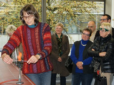 Dr. Susanne Garreis zeigt den Gästen, wie Glas über dem Bunsen-brenner