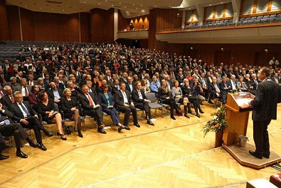 "jetzt stehen wir gemeinsam unter dem Schirm der Zukunft" und bot die engste