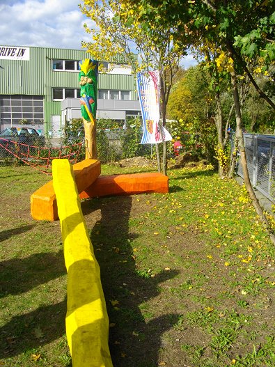 überdimensional große und leuchtend bunte Skulpturen aus Holz. Auch im