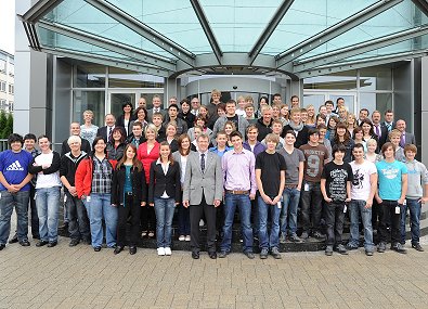 Zeiss-Auszubildende vor dem Hochhaus in Oberkochen: