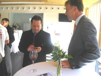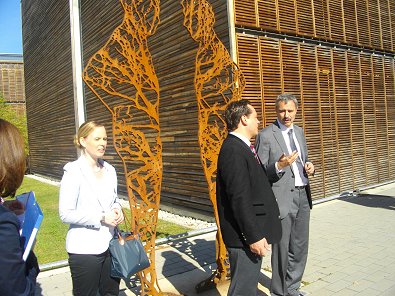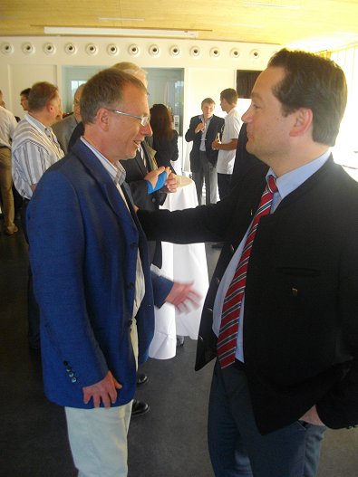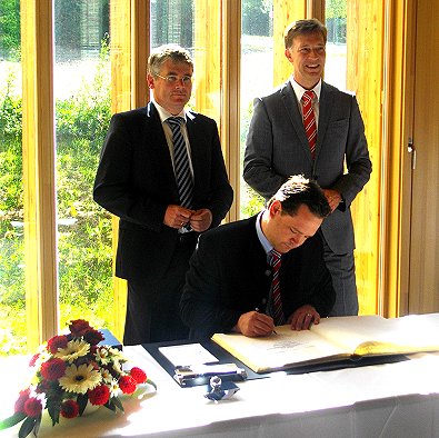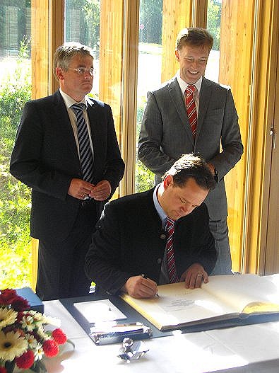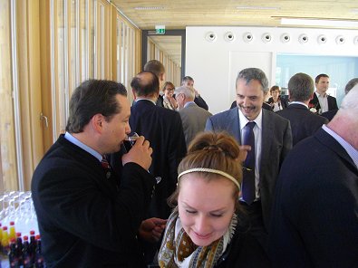 Nun ging es hoch zur Cafeteria und da kam der Promi-Troß mit Minister Bonde,