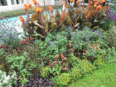 Blumenwunder im Herbst an gesamter Stadthalle-Front in Blumen-stadt