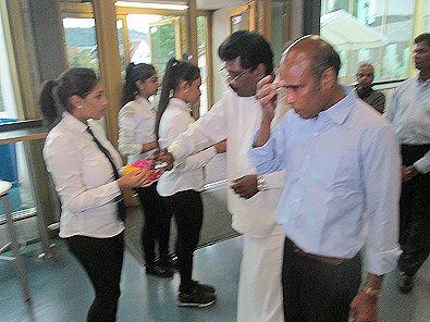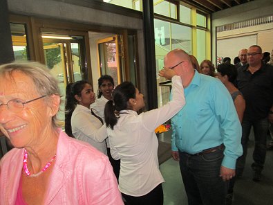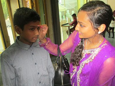 der Tradition die Gäste einen bunten Punkt auf die Stirn bekamen als Zeichen
