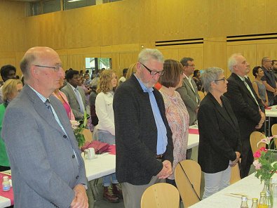 alle zum Aufstehen gebeten hat und sagte: "Wir gedenken alle gemeinsam an