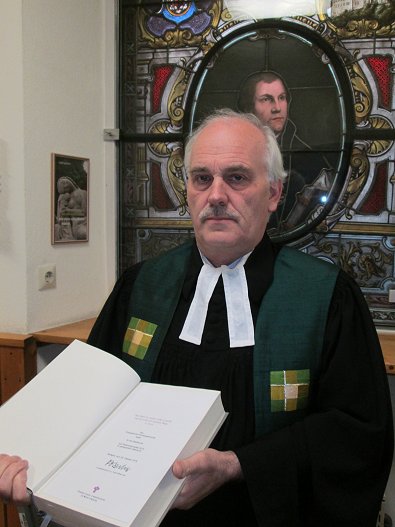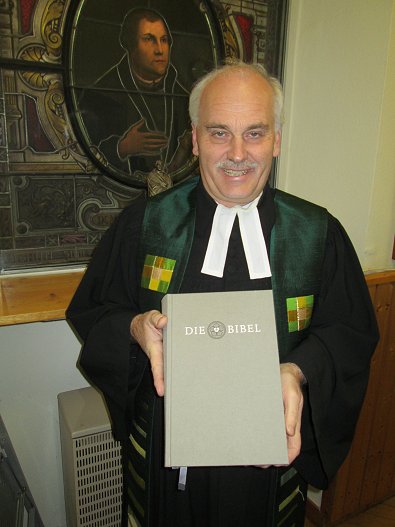 Sakristei der Stadtkirche mit neuen Bibel und im Hintergrund Martin Luther.