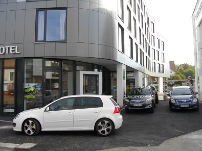 vier Fahrzeuge sogar auf dem Gehweg parkten obwohl das neue Hotel über eine