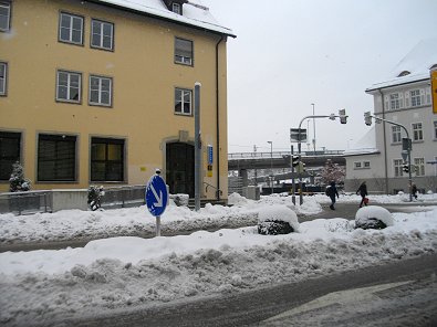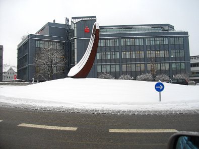 KSK-Kreisel mit rostigem Steinbach-Denkmal und natürlich Schnee.