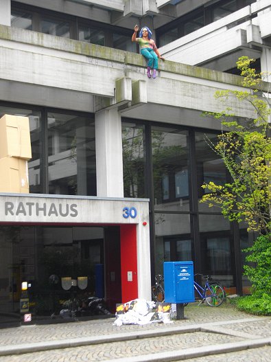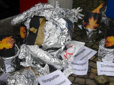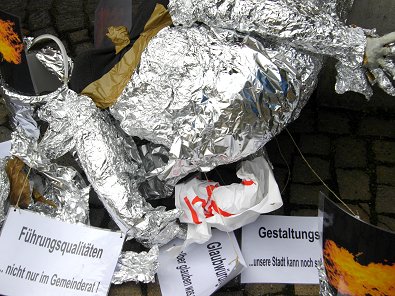 vor dem Rathauseingang weiteren Müll in Staniol verpackt und mit Hinweisen