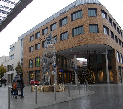 Weihnachtsbeleuchtung und dem Parade-Hirsch zwischen Ärztehaus und