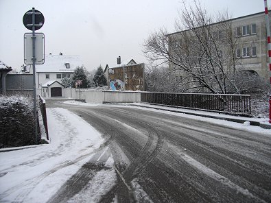 Margarete-Steiff-Straße ausgangs einer Linkskurve auf schneebedeckter