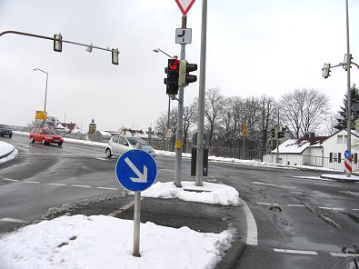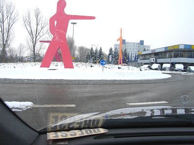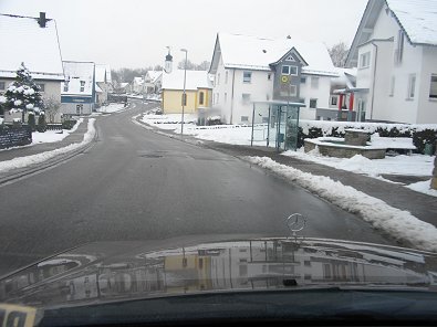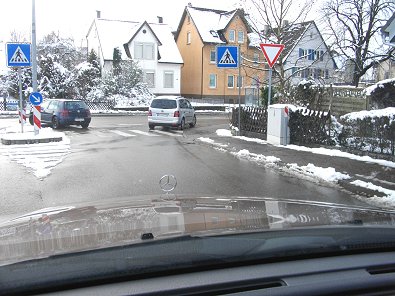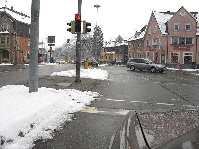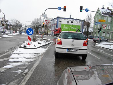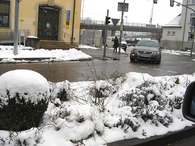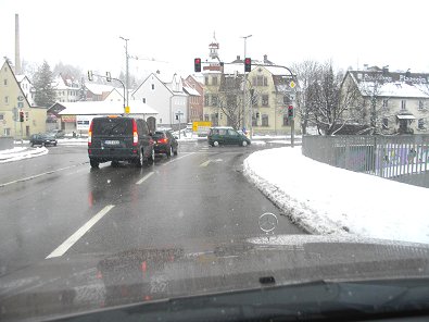 schneeglatter Strecke den Kreisverkehr an der Gmünder Straße. Der Pkw
