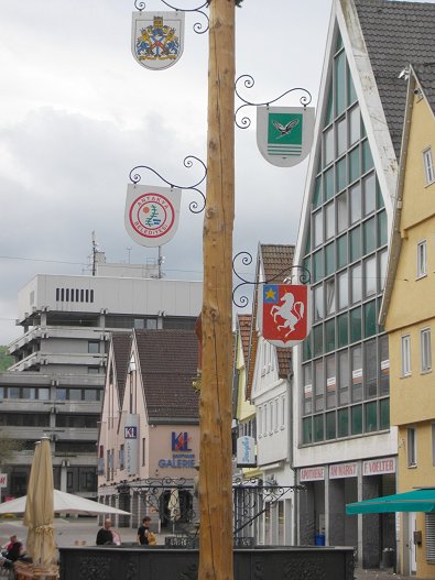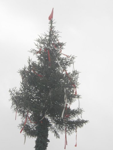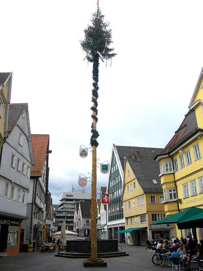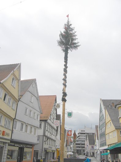 Er steht noch u. nicht angesägt: der Aalener Maibaum am Brunnen.