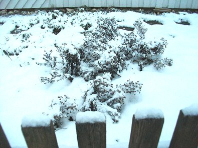 Rosenstrauch des Nachbarn (rechts) im typischen Winterkleid.