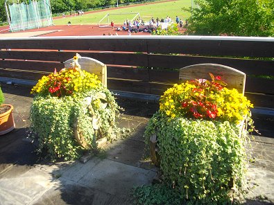 Blumenarrangements auf der Terrasse des MTV-Stadions.