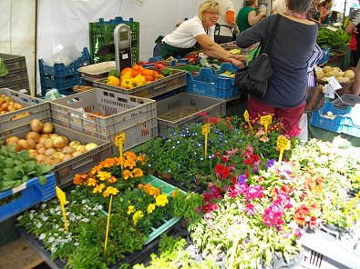 City-Marktständen viele Blumen.