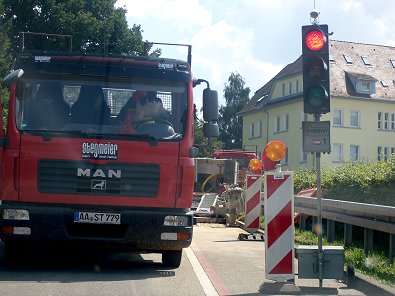 Verkehr Tag und Nach durch Ampeln geregelt u. "Ärgernis". AIZ-Fotos: Dieter Geissbauer