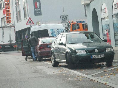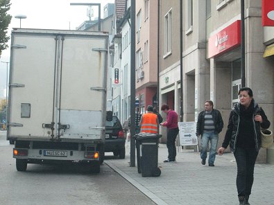 stundenlang der direkt vor dem 1-und1-€-Laden auf dem Gehweg parkte und so