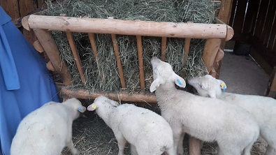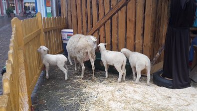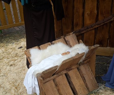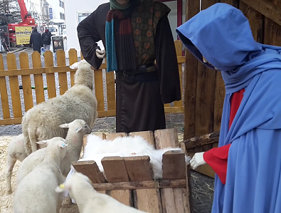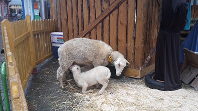 Weihnachtsmarkt mit den Schäfchen statt Stroh in der Krippe weiße Pelze