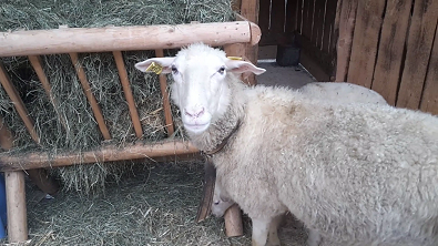 ein Zuchtschaf, das südlich des Regenrückhaltebeckens Richtung Waldrand im