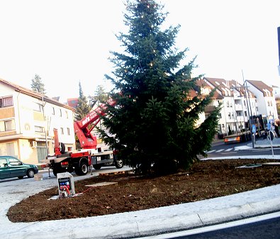 dem neuen Hüttlinger Kreisel der erste Weihnachtsbaum am Vortag: Eine