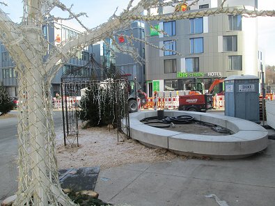 Straßenbauarbeiten. Dann gegenüber dem Ibis-Hotel ein Becken von etwa 1.000