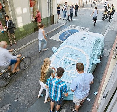 Denkzettel-Aktion online". Es zeigt, wie ein falsch geparktes Auto von einem Promotion-Team komplett mit Post-It-Zetteln umhüllt wird, die mit dem
