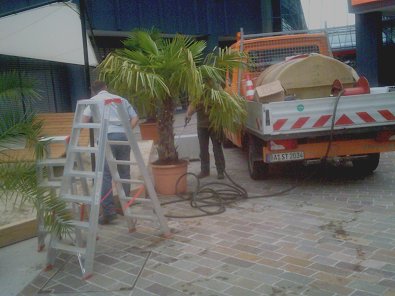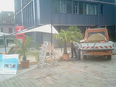 Städtischer Service: Wasser für die Palme im Sand am Sparkassen-Platz am