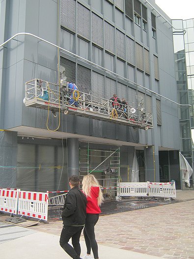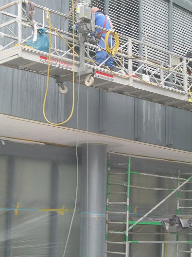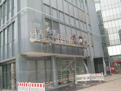 Reinigungsfirma die KSK-Sch-eiben in luftiger Höhe geputzt.