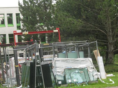Ansammlung von Baumaterial und Fenstern ebenso wie die Anwohner nur staunen