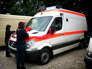 ehrenamtliche MHD-Damen schmücken neues Fahrzeug gerne.