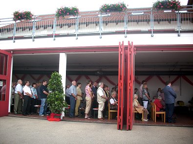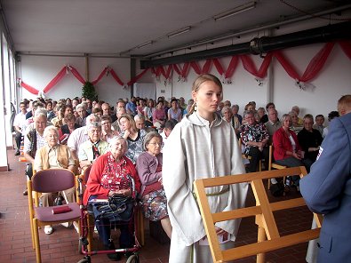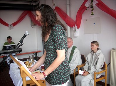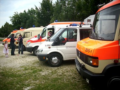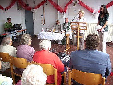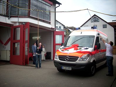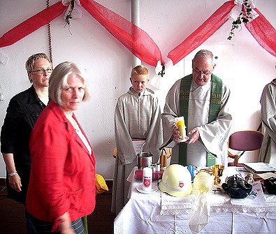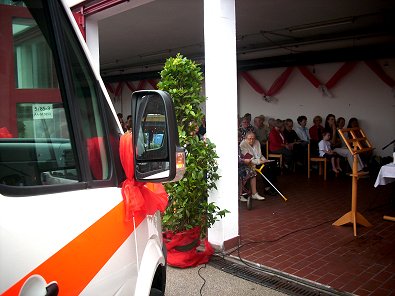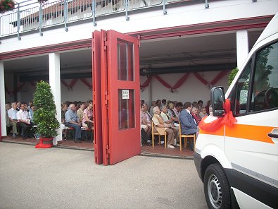 Menschen gut besuchten Gottesdienstes am Sonntag dem 2. August 2009 in der Fahrzeughalle in der Gerockstraße die Fahrzeug-Segnung des neuen Einsatzfahrzeuges.