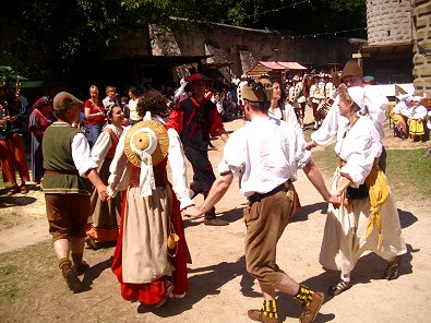 füllte und Mädchen und Knappen auf dem Burghof lustige und alte Tänze