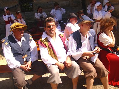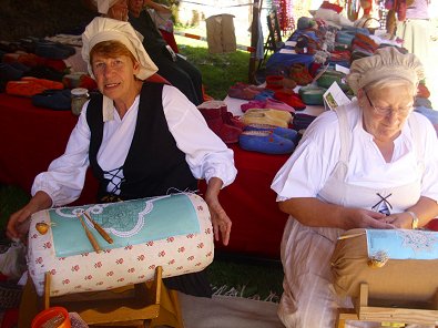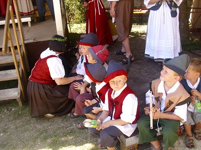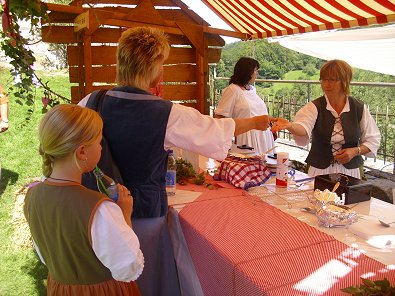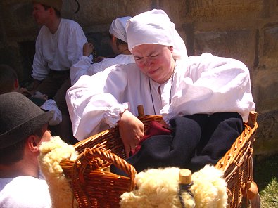 am Spinnrad ebenfalls in dama-liger Tracht trotz 30 Grad Hitze vorzuführen.