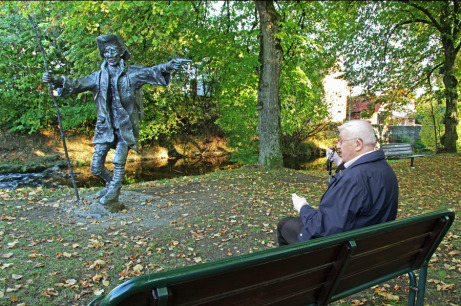 einer idyllischen Grünfläche eine lebensgroße Figur im Eisenkunstguss. Sie