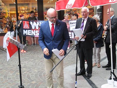 Und trotzdem: trotz aller Erinnerung, trotz aller Mahnung, trotz aller Zeichen gegen das Vergessen ist unsere Welt nicht friedlicher geworden. Haben auch nach 1945 unzählige Kriege stattgefunden. Die Menschheit ist nicht klüger geworden und täglich neue Krisenherde und kriegerische Auseinandersetzungen machen deutlich, wie zerbrechlich der Frieden auf unserer Welt ist und wie wichtig es darum auch sein wird, heute und in Zukunft alles daran zu setzen, dass nie wieder Krieg, nie wieder Faschismus, nicht nur ein gewerkschaftlicher Appell bleibt, nicht zu abgedroschenen Phrase wird, sondern tagtäglich neu mit Leben gefüllt und praktiziert wird.